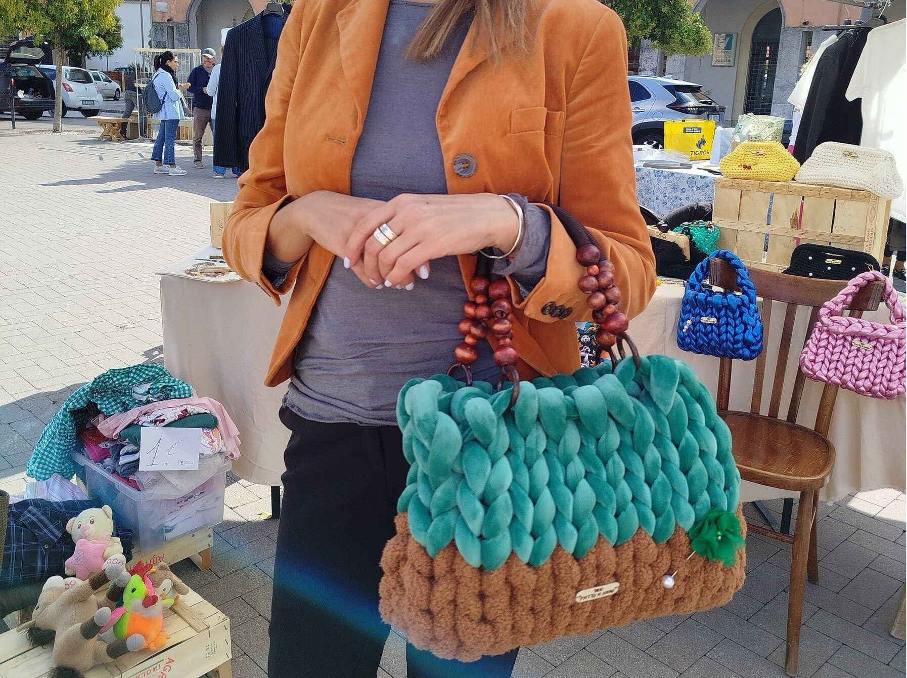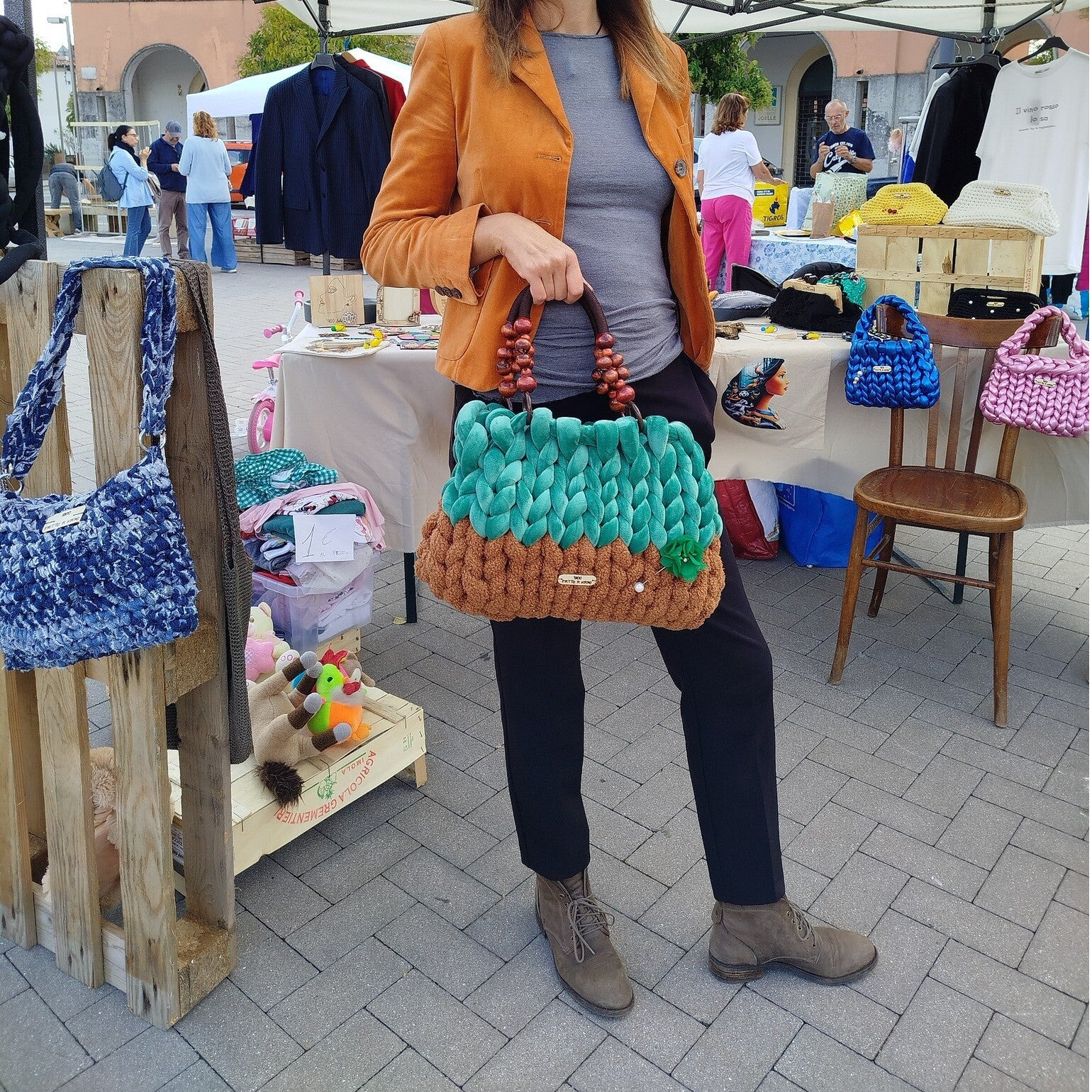 borsa artigianale creata a mano con filato gigante. Pezzo unico. Dotato di fodera/sacca, estraibile e richiudibile che potete usare per riporla quando non la utilizzate.